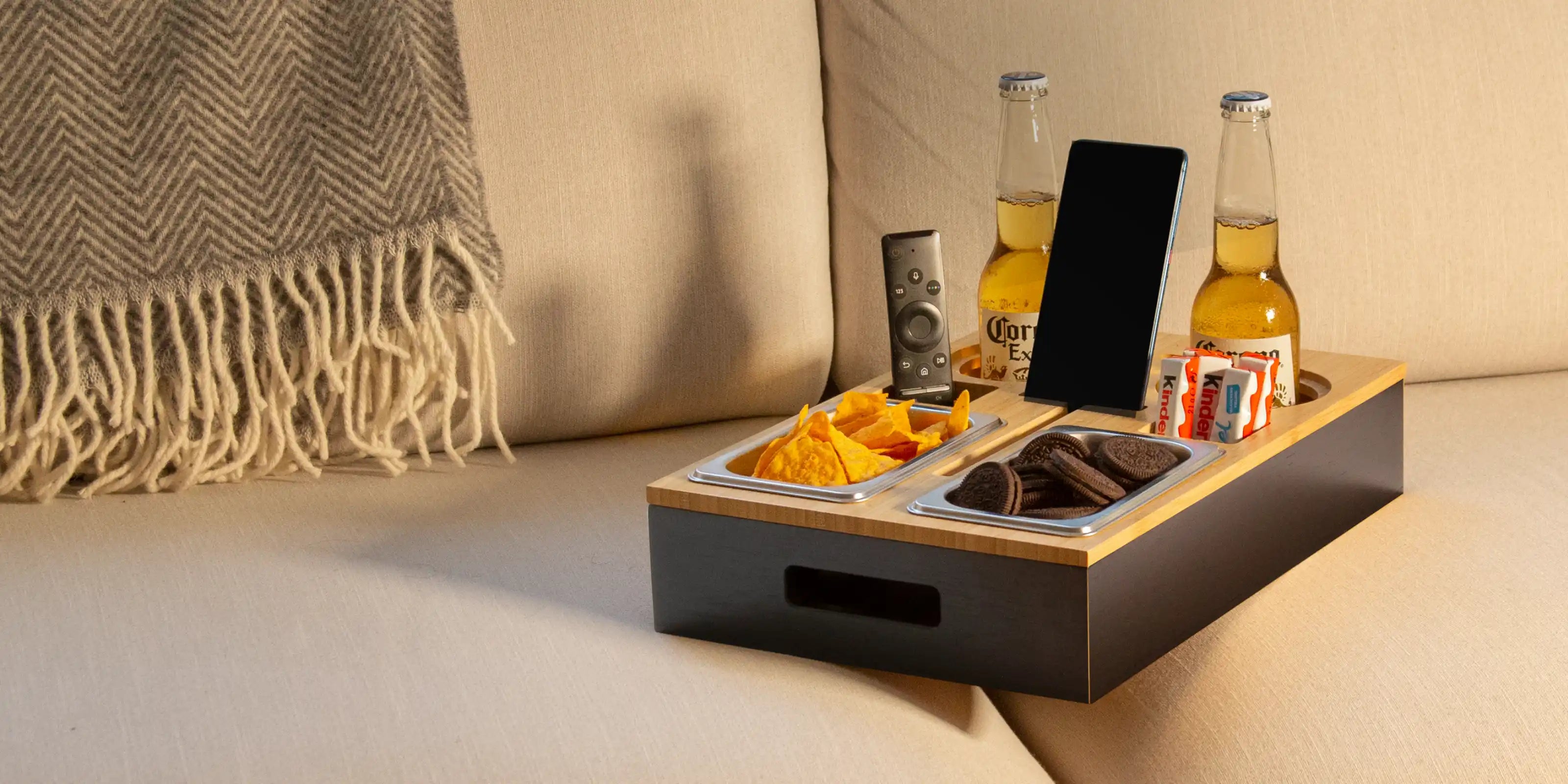 Für unsere Couchbutler verwenden wir ausschließlich hochwertige und nachhaltige Materialien wie robusten Bambus. Dieses Naturmaterial sorgt nicht nur für eine moderne und warme Optik, sondern auch für Stabilität, Langlebigkeit und eine angenehme Haptik. Zudem ist Bambus besonders pflegeleicht und widerstandsfähig – perfekt für den täglichen Einsatz auf der Couch!