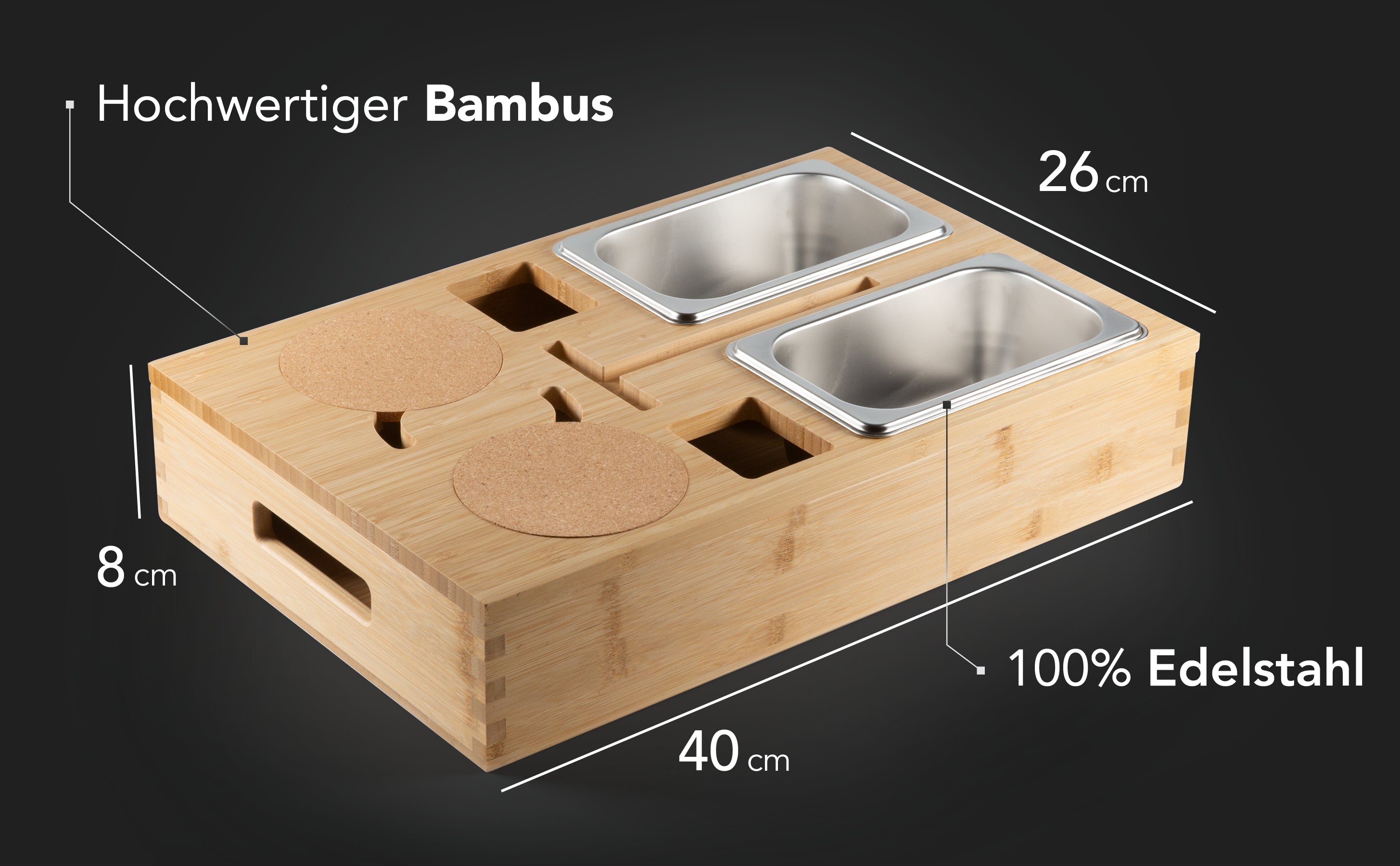HOCHWERTIGE MATERIALIEN: Die Snackbar ist aus nachhaltigem Bambus gefertigt und verfügt über spülmaschinenfeste Edelstahl-Schalen und hochwertige Kork-Deckel, die zusätzliche als Untersetzer für Gläser und Flaschen genutzt werden können.