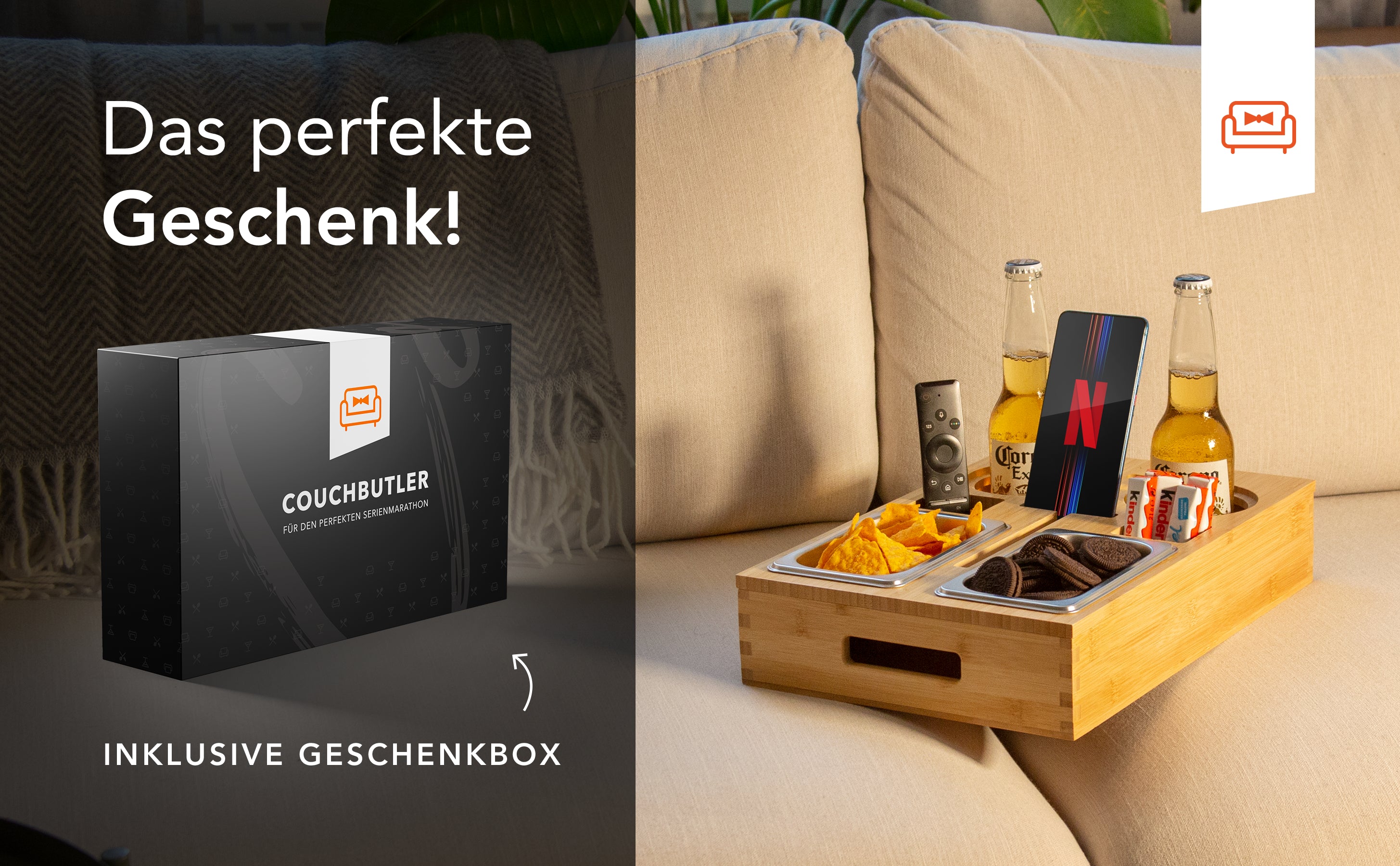 Überrasche deine Liebsten mit einem einzigartigen Geschenk! Der Couchbutler kommt in einer stilvollen Geschenkbox und ist sofort bereit zum Überreichen – ideal für Geburtstage, Weihnachten oder besondere Anlässe.